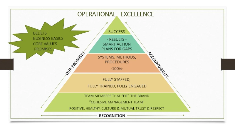 Once we know we have a worthwhile brand, the idea is brought to life with execution at a high and consistent level. The Operational Excellence Framework is a building block way of thinking about the performance required to be wildly successful. It begins with a foundation of the “right people” that fit the brand with a positive, healthy culture brought together with mutual respect and trust—all led by an aligned management team that speaks with one voice.